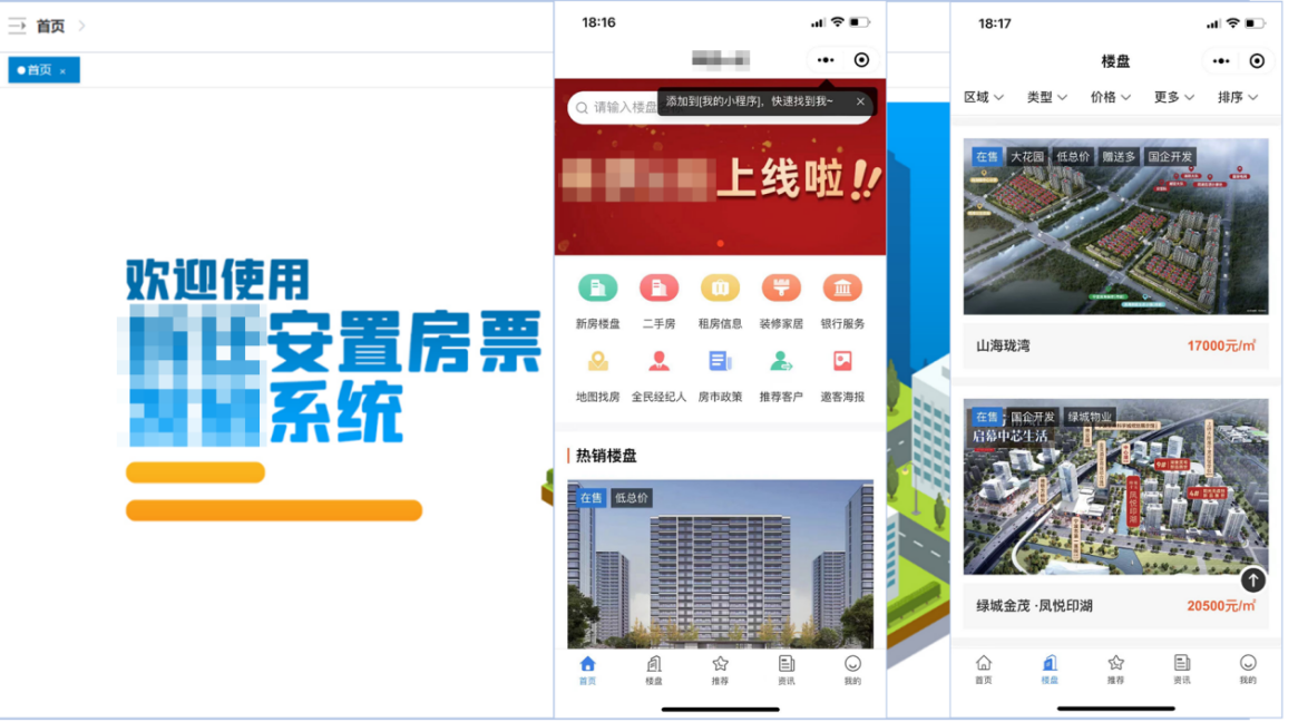 提供楼盘展示、电子房票查询,并集成公积金、房贷、租房服务等推荐服务。