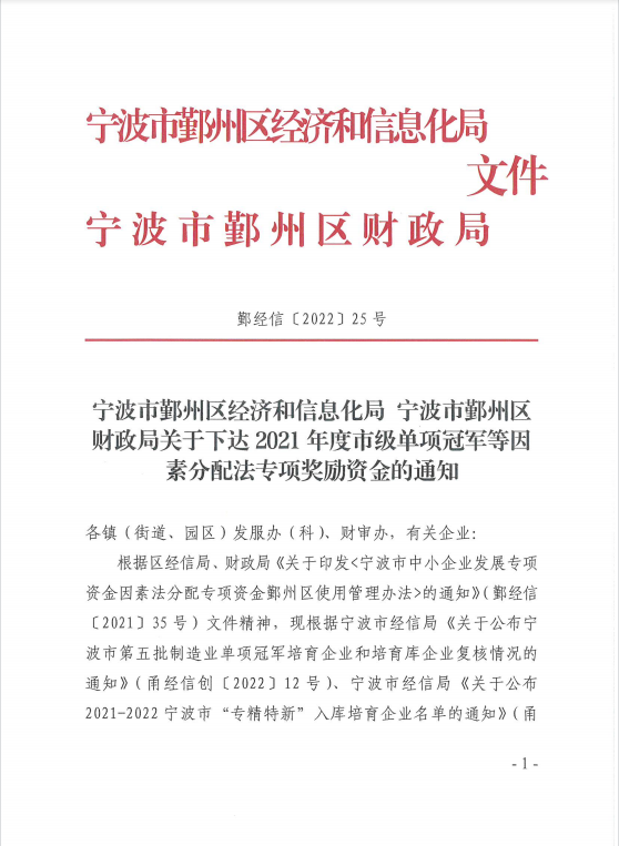 入选宁波市“专精特新”中小企业名单