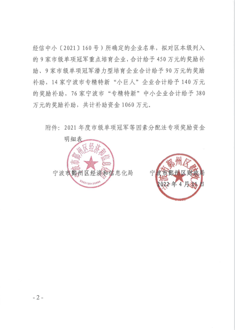 2、2021年宁波市“专精特新”中小企业